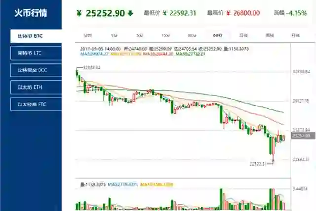 国内交易平台方面,9月5日比特币价格再次遭到重创,比特币盘中连续跌破26000元、25000元、24000元、23000元等多个整数关口。火币网数据显示,最低价曾一度跌至22592.31元,最大跌幅达21%。而OKCoin币行价格则最低达22549.9元,振幅17.56%。