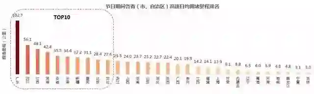 从节日期间各省高速拥堵里程排名看,南方高速拥堵要高于北方,其中广东省高速拥堵里程最高,达102.7公里。从各省拥堵里程占比分布看,高速拥堵里程占比最高的为北京,其次为上海、广东、重庆、江苏等省市,排名最后的为东北三省。
