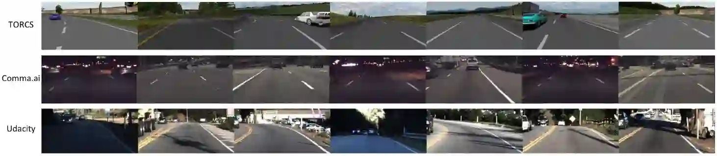 图 4:我们的工作所用的样本数据。从上到下:TORCS 模拟器得到的虚拟数据,来自 comma.ai 的真实驾驶数据,来自 Udacity 挑战赛的真实驾驶数据。