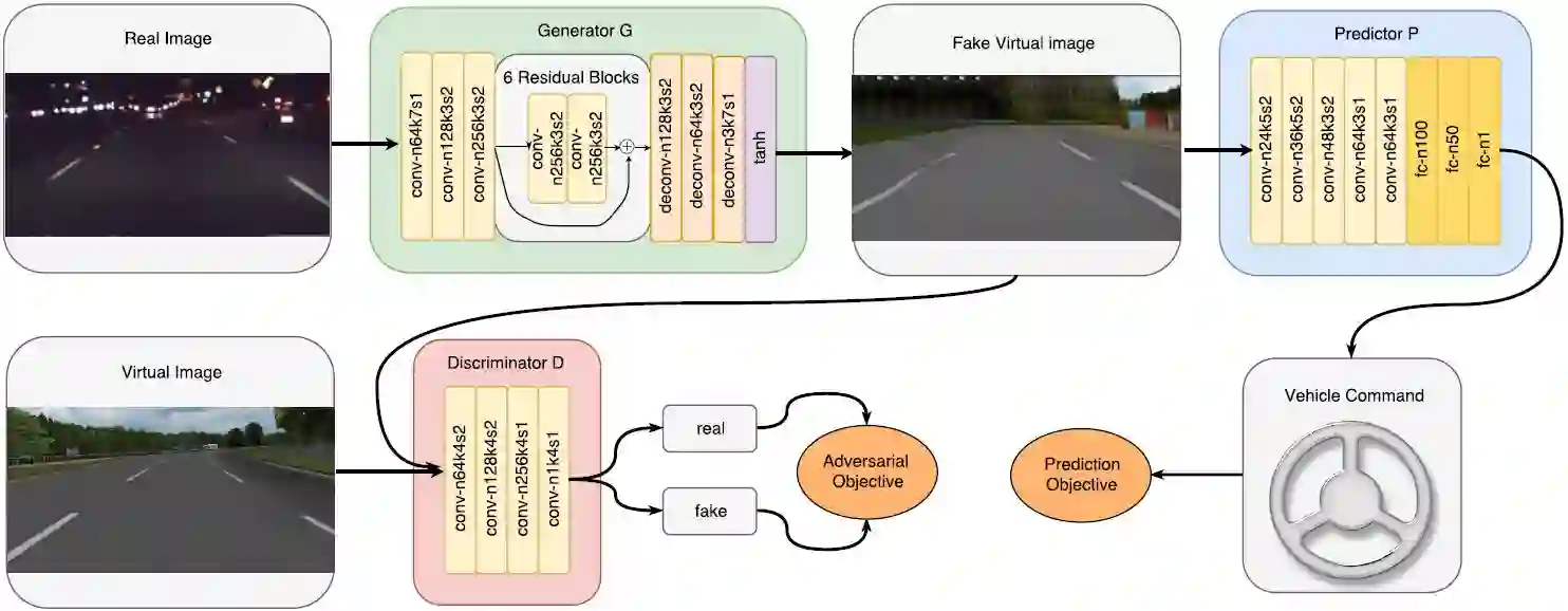 这促使我们开发了一个可以有效地将真实驾驶图像变换成它们在虚拟域中的规范表征的系统,从而有助于执行车辆指令预测任务。很多已有的研究工作利用虚拟数据的方式是使用生成对抗网络(GAN)将虚拟图像变换成看起来很真实的图像 [12],同时在辅助目标的帮助下保持标注的完整 [34,7]。我们的方法虽然也是基于 GAN,但却有几方面的不同之处。首先,我们的目的是将真实图像变换成它们在虚拟域中的规范表征,而不是反过来。我们所说的规范表征(canonical representation)是指从背景中分离出了对该预测任务而言最少充分信息的像素级表征。因为任何图像都只能有一个规范表征,所以我们不会在生成过程中引入任何噪声变量。其次,我们不会试图直接保留标注,因为我们不清楚到底是图像中的哪些信号确定了车辆指令。相反,我们提出了一种全新的联合训练方案,可以将对预测而言关键的信息逐渐地提取到生成器中,这还能使训练稳定化以及防止驾驶关键信息的模式崩溃(mode collapse)。