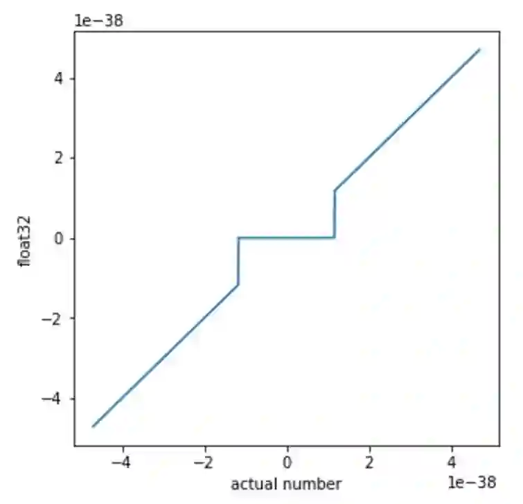 按照这种惯例和二进制格式,以二进制表示的最小非零正常数是 1.0..0 x 2^-126,以下用 min 来指代。而下一个可表示的数是 1.0..01 x 2^-126,可以写作 min+0.0..01 x 2^-126。很显然,第一和第二个数之间的 gap 比 0 和 min 之间的 gap 小了 2^20 倍。在 float32 标准中,当一个数比最小的可表示数还小的时候,则该数字将被映射为零。因此,近邻零的所有包含浮点数的计算都将是非线性的。(而反常数是例外,它们在一些计算硬件上可能不可用。在我们的案例中通过设置归零(flush to zero,FTZ)解决这个问题,即将所有的反常数当成零。)