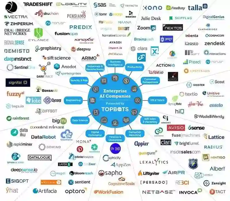 为了确定最适你业务的工具,我们将企业的人工智能解决方案图景按照功能类别来划分,这样以匹配组织工作流程和使用案例。大多数公司企业能分为多个类别,但本文专注于每一个公司的主要附加值和差异化部分。