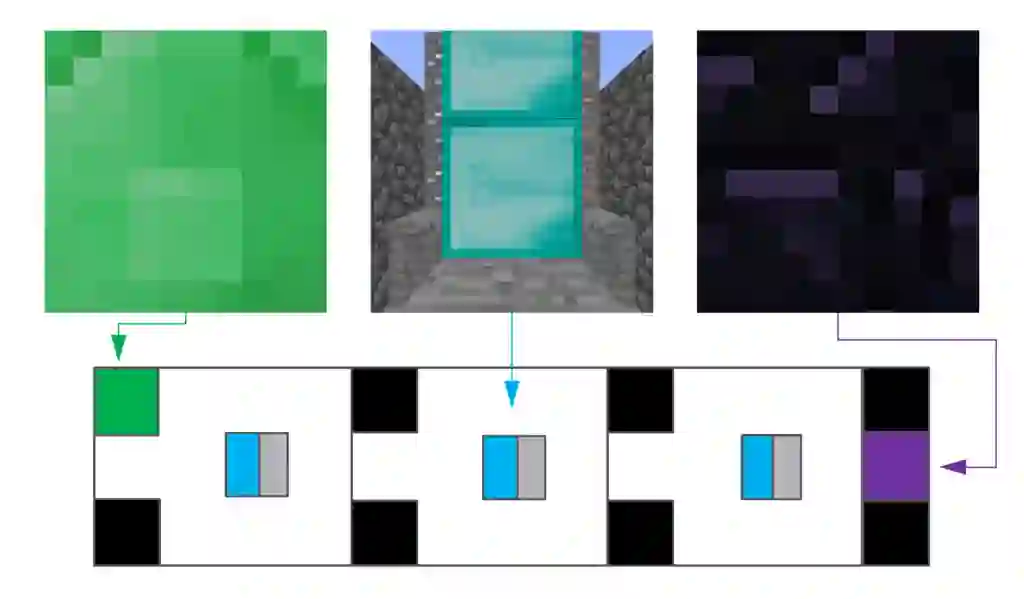 图3:用于测试智能体记忆能力的“我的世界”迷宫俯视图(下方),以及智能体在该环境中移动时可能看到的观察样本(上方)。