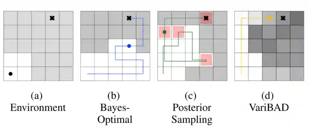 图4:不同探索策略的图示。(a)场景:智能体从左下方开始,在灰色区域的某处存在一个目标位置,但智能体并不知道。(b)贝叶斯最优智能体策略,系统地搜索可能的网格单元以找到目标位置,以蓝实线(到目前为止的互动)和蓝虚线(未来的互动)标示,在背景中,以灰色(p = 1 /(余下可能目标位置数量,或可能包含目标位置的格子数量)和白色(p = 0))显示简化的后验值。(c)后验采样机制对可能的目标位置(红色方块)反复采样,并采用最短路径到达该位置,这是次优策略,一旦发现目标位置,每个样本都将与真实的目标位置相匹配,则表明智能体采取了最佳行动。(d)VariBAD 学习的探索策略。灰色背景表示智能体已学习到的后验近似值。