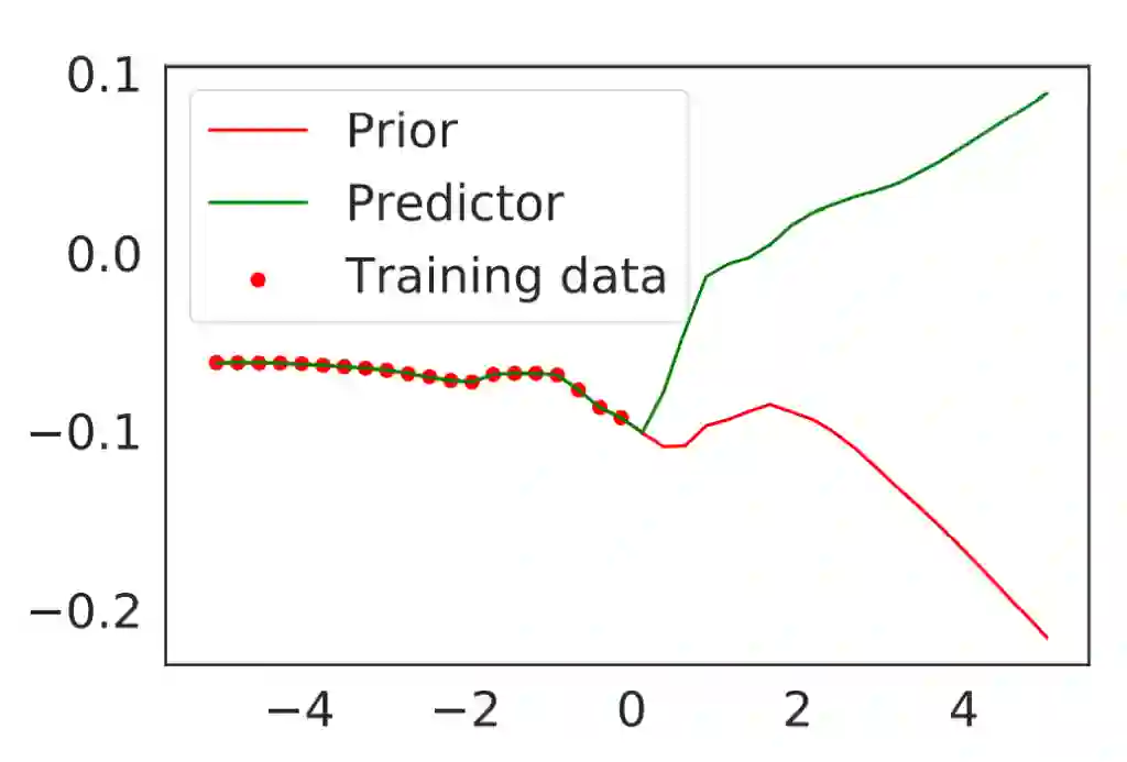 图1:预测函数(绿色)和先验函数(红色)在可见数据上达成共识(左),而在不可见数据上未达成共识(右)。研究员们将某一点上不确定性的估计值定义为“先验值与预测值之间的差距”。
