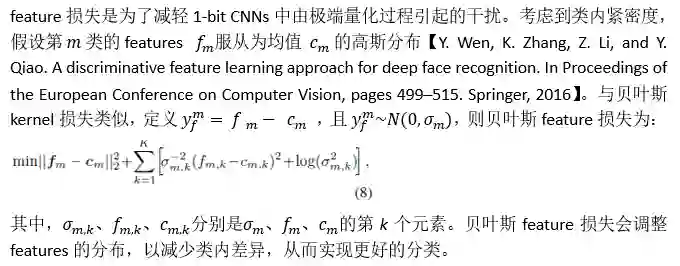 考虑贝叶斯框架中kernels和features的先验分布,实现了两个新的贝叶斯损失,以优化1-bit CNNs的计算。贝叶斯kernel损失改善了各卷积层的分层kernel分布,而贝叶斯feature损失引入了类内紧密度(intra-class compactness)以减轻量化过程带来的干扰。注意,贝叶斯feature损失仅适用于全连接层。