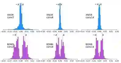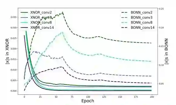 下图显示了XNOR Net和BONN训练过程中二值化值的演变,表明在BONN中学习到的二值化值更加多样化。