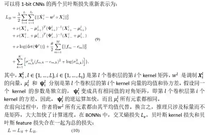 作者提出了贝叶斯优化的1-bit CNNs(BONN),该模型考虑了全精度kernel和features分布,从而形成了具有两个新贝叶斯损失的统一贝叶斯框架。贝叶斯损失用于调整kernel和features的分布,以达到最佳解决方案。