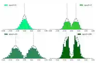 如下图所示为BONNs第1个二值化卷积层的kernel权重分布。在训练之前,将kernel初始化为单模高斯分布。从第2个到第200个epoch,两种模式下的kernel权重分布在变得越来越紧凑,证明了贝叶斯kernel损失可以将kernel正则化为可能的二进制分布。