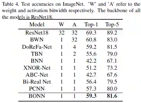 在BONN中,BONN遵循XNOR-Net采用的策略,该策略在第一个卷积层,所有1×1卷积和全连接层中保持全精度参数,由此,ResNet18的总体压缩率为11.10。对于效率分析,如果卷积的所有操作数都是二进制的,可以通过XNOR和位计数操作来估计卷积【M. Courbariaux, I. Hubara, D. Soudry, R. El-Yaniv, and Y. Bengio. Binarized neural networks: Training deep neural networks with weights and activations constrained to+ 1 or- 1. arXiv preprint arXiv:1602.02830, 2016】。