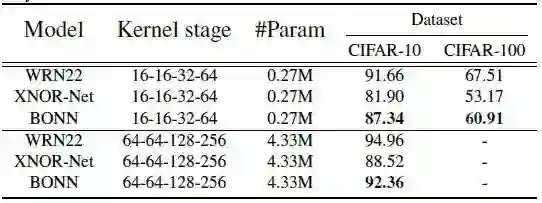 作者使用Three WRN变种:22层WRN,kernel stage为16-16-32-64和64-64-128-256。如下表所示,BONN在两个数据集上的性能均优于XNOR Net。即使与全精度WRN相比,BONN性能也相当不错 。