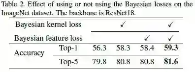 作者使用WRN22在CIFAR-10数据集上,结果如下表所示,贝叶斯kernel损失和贝叶斯feature损失都可以提高准确度,一起使用时,Top-1准确度达到最高59.3%。