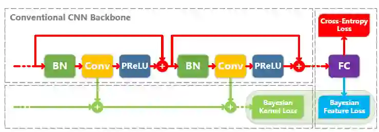 作者利用贝叶斯学习的有效性以端到端的方式构建1-bit CNNs。特别地,引入了两个新的贝叶斯损失,在此基础上优化1-bit CNNs,提高了效率和稳定性。在统一的理论框架下,这些贝叶斯损失不仅考虑了1-bit CNNs的kernel、weight分布,而且还监督了feature分布。下图显示了损失如何与CNN backbone相互作用。