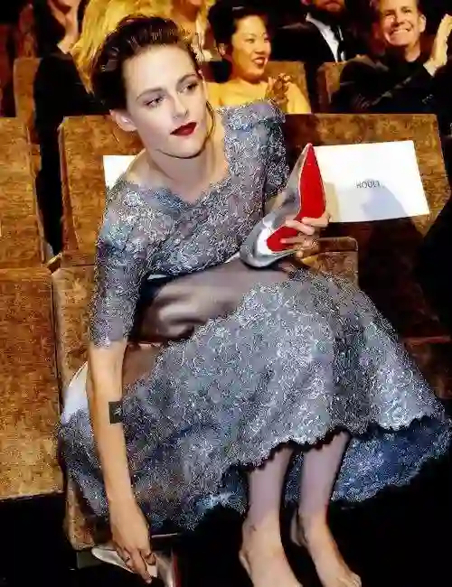 2015年,暮光女克里斯汀曾脚蹬一双银色尖头细跟红底鞋出席威尼斯影展的《禁爱世界》首映,一落座,这位向来率性的女演员就当众脱掉了高跟鞋。去年,坎城影展的时候,这位女士在红毯拍摄结束后就立马二话不说脱掉了脚上的红底鞋。鞋头窄+鞋底硬+恨天高,脚踩Christian Louboutin,你就是喝了女巫药水的美人鱼呀。