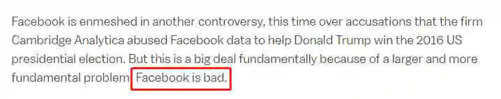 Facebook 被称作是全球最大的媒体网站,因此该企业树敌无数。媒体网站 Vox 在 Facebook 隐私泄露事件后发文指责后者,称“这无关政策,问题在于 Facebook 的核心商业模式”。在 Vox 的文章中,Facebook 核心商业模式就是“出卖用户”,正是他们开放了 API 接口,才有了今天的地位。Vox 激进的指出,Facebook 本身就是坏的。