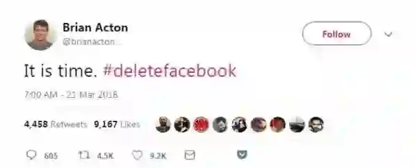 通信软件 Whatsapp 的联合创始人 Brain Acton 在推特上发文称,“是时候删除 Facebook 了”,并且在这条信息后面加上了“删除 Facebook”(#deletefacebook)的标签。不过这个标签并没有多火,仅有极少数用户发起了“删除 Facebook”标签。