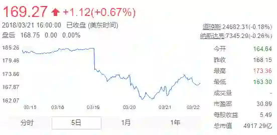 图丨3月21日收盘时Facebook的股价,能明显看到3月19日的断崖,已有小幅度反弹