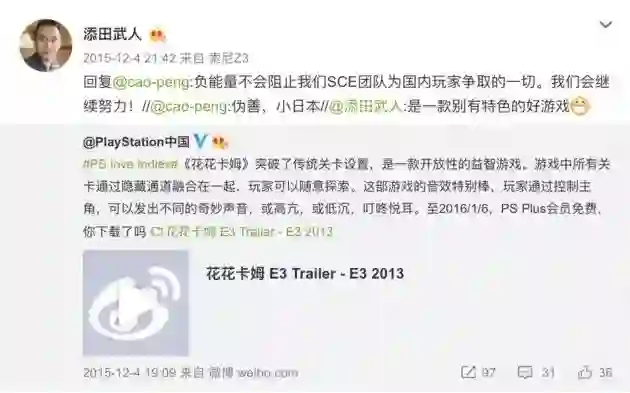在中国出生长大、大学在北大学文学的添田武人,去台湾乘出租车被司机误认为是北京人。他知道索尼粉丝喜欢“为信仰充值”,还会用谐音,希望玩家能“天天五人”——一天安利五个人玩 PlayStation。粉丝们亲切地称他为“五仁叔”。对此,10月28日上午在索尼(中国)北京办公室,添田武人对果壳说:“我们做得那么烂,玩家还能够这样支持我们,这是件很不容易的事情。”