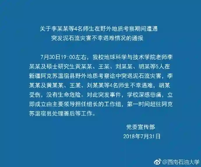 据成都商报7月31日消息,当晚记者从西南石油大学了解到,该校一名老师带领4名硕士研究生在新疆阿克苏温宿县开展野外地质考察时,遭遇泥石流,造成含老师在内的4名师生不幸遇难。