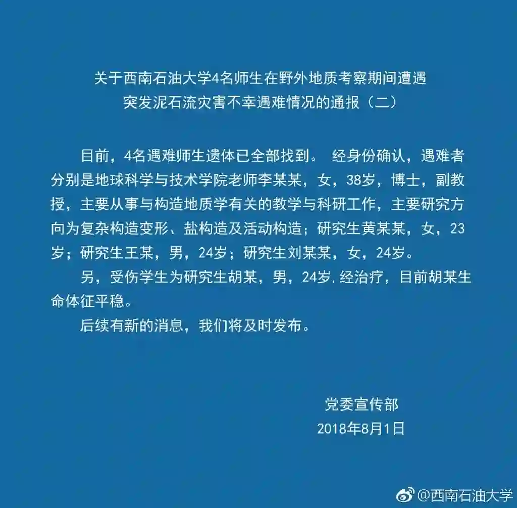 8月1日上午,西南石油大学官方微博发布第二条情况通报:4名遇难师生遗体已经全部找到,一名受伤学生目前生命体征平稳。