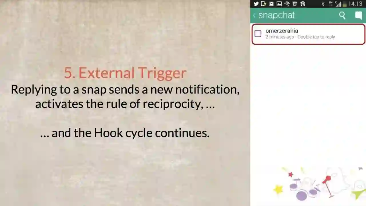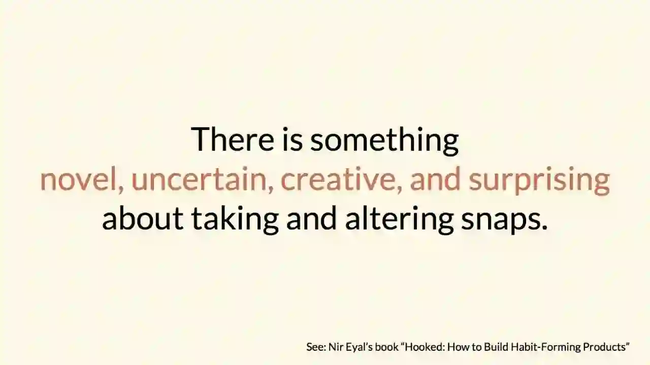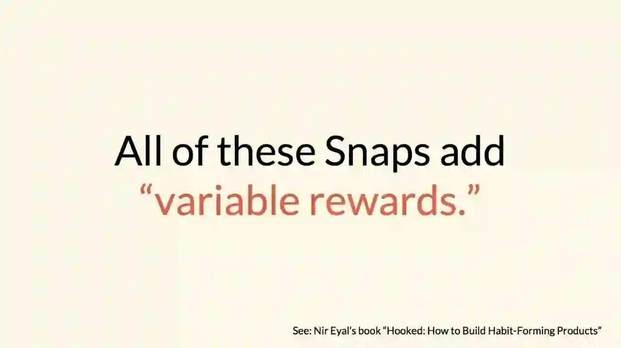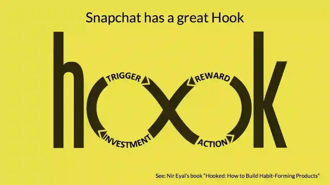 《Hooked:How to Build Habit-Forming Products》是一本教你如何打造一款让人「上瘾」、形成习惯的产品的畅销书,作者 Nir Eyal 在 2015 年发布了一个名为《The Secret Psychology of Snapchat》的 slides,讲解了 Snapchat 为何能够如此流行,并持续具备生命力。
