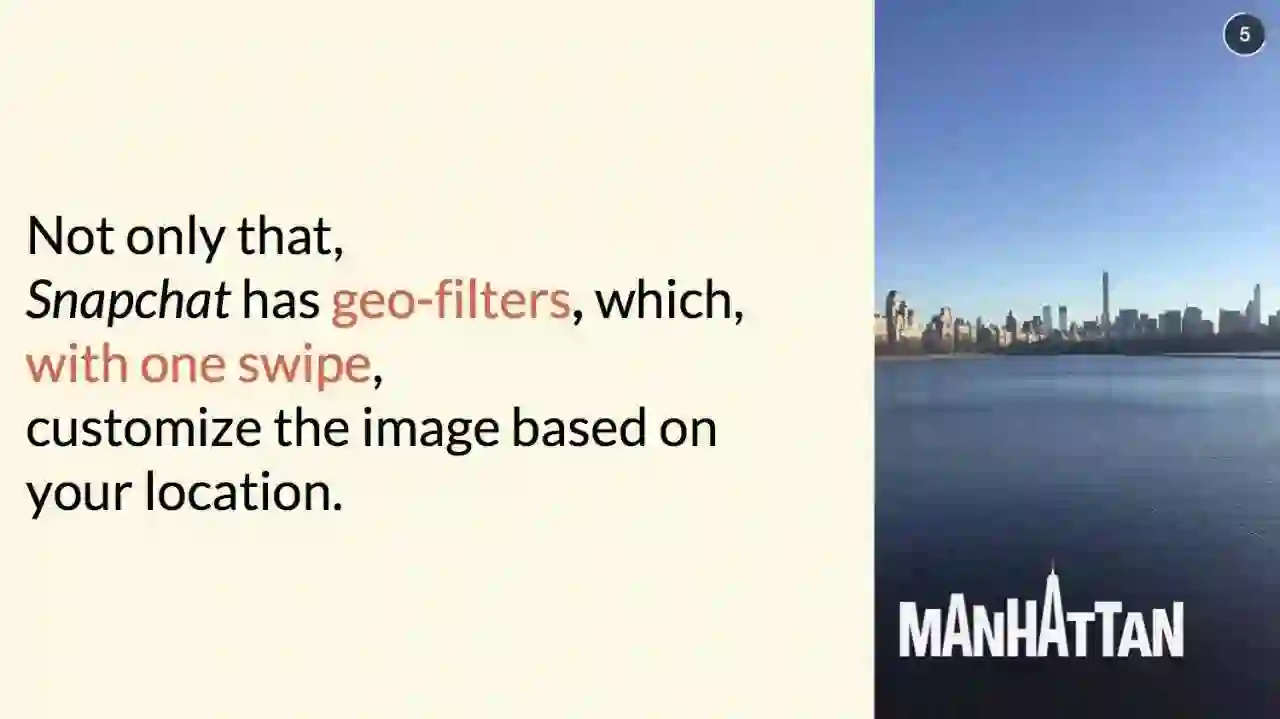 不仅如此,Snapchat 还有地理过滤器,只要一划,根据你所处的位置个性化你的照片。