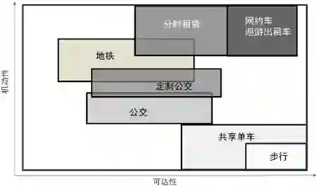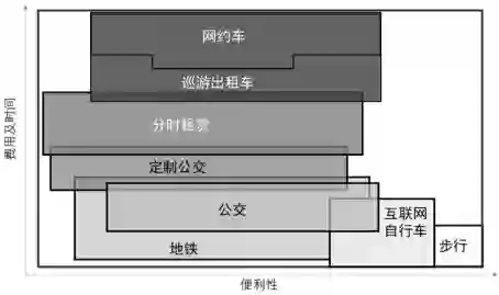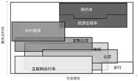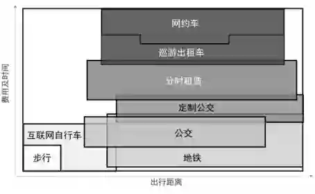 结合传统的公共交通(常规公交和地铁)、传统巡游出租车和步行,可将4类共享交通方式在交通体系中的相对位置进行标定,剖析新旧业态之间的竞争、接驳、弥补关系。