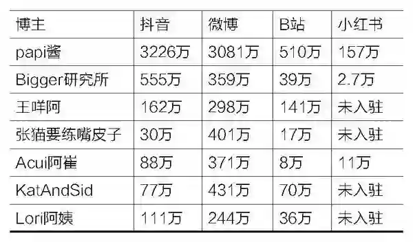 对比之下,papitube旗下达人情况就逊色多了。尽管多数走泛娱乐路线,但从平台入驻情况上来看,却并没有走向大众化。即便是已入驻的平台,不仅粉丝数量、播放数量等数据也存在着明显差异,从影响力看也并未诞生出下一个“papi酱”。