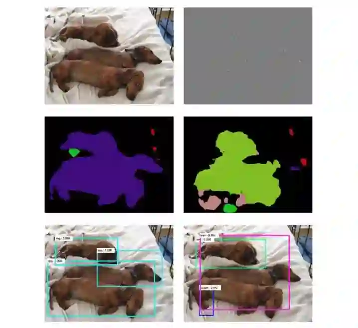 用于分割和检测的模型:FCN 和 Faster-RCNN 。左列第三个图的分割和检测识别的结果都非常好,加入干扰后的样本,无论是分割还是识别结果都出现了悬殊差异,有“人”,有“火车”......