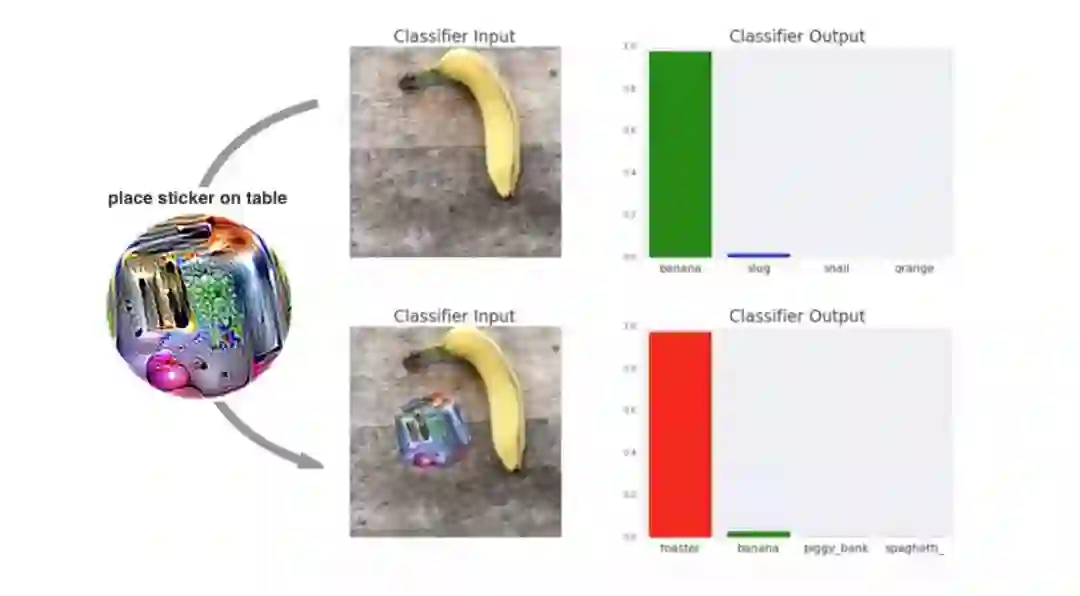 前一段时间,Google Brain 的研究员发现,在一根香蕉的旁边放了一张贴纸,模型就不认识这根香蕉了,硬要说人家是面包机。