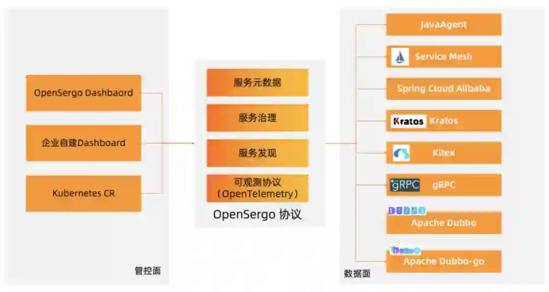 OpenSergo Spec:Spec 规定了控制面和数据面的通信约定,确保用户使用一种 Spec 即可描述不同框架、不同协议、不同语言的微服务架构。