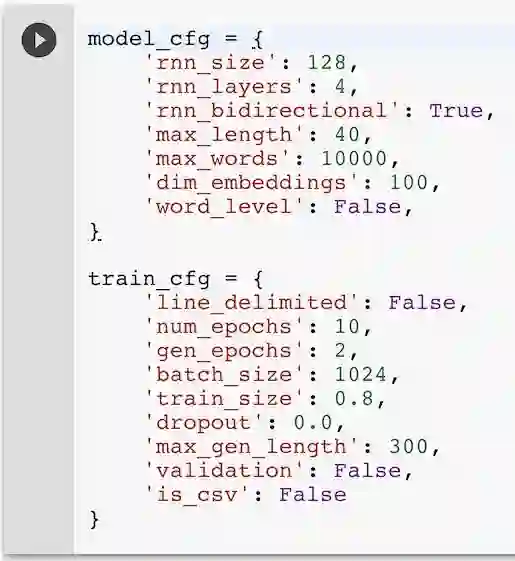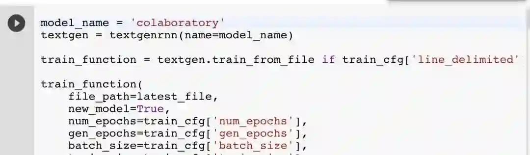 textgenrnn 的一个好处是它可以免费使用「Google Colaboratory」很容易地在 GPU 上快速地训练神经网络。我创建了一个 notebook(https:// drive.google.com/ file/d/ 1mMKGnVxirJnqDViH7BDJxFqWrsXlPSoK/ view),它可以让你仅仅通过几次点击就能够训练自己的网络并且生成文本。