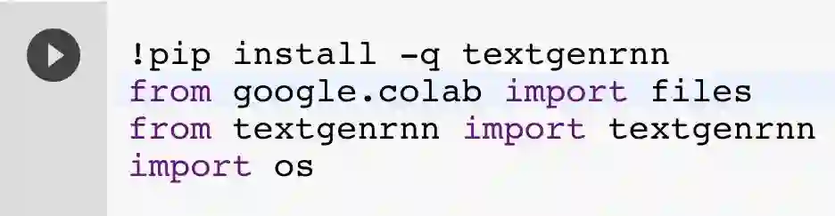 首先,我建议将该 notebook 复制到硬盘上(如果你没有这么做,那么请使用 Google Chrome 浏览器访问它)。Colaboratory 虚拟机包含了 Python 3 和像「Tensorflow」这样用于机器学习的通用 Python 程序包。但是你可以直接在 notebook 中安装更多的程序包。比如 textgenrnn!只需要点击进入这个单元并且点击「play」按钮(或者使用 Shift + Enter)即可运行这个单元格,其它的部分都将由它控制: