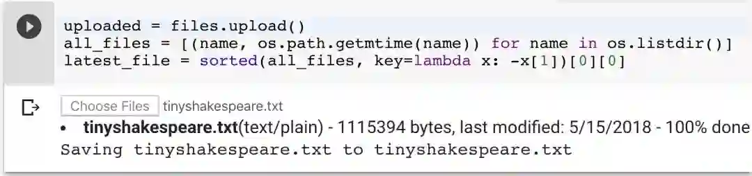 现在让我们保留这些默认的参数,运行该单元将它们加载到内存中。运行下一个单元,它会提示你上传一个文件。任何文本文件都应该能工作,甚至是很大的文本文件!在这个例子中,本文将使用一个在 char-rnn demo 中也使用过的 1.1MB 莎士比亚戏剧的文本文件。