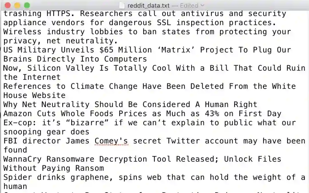 然而,Reddit 上有数以百万计的文章标题,这非常有益于训练模型。我写了一个能够在给定的时间内从给定的「subreddit」板块上自动下载自上而下的 n 条 Reddit 文章的 helper 脚本(https://github.com/minimaxir/subreddit-generator)。如果你选择了有相似语言风格的 subreddit,这些 subreddit 甚至会合并在一起!这里,我们获取了 2017 年/r/politics 和/r/technology 板块的前 20000 条文章,最终形成了一个 3.3MB 的文件,其数据大小大约是莎士比亚戏剧数据的 3 倍。