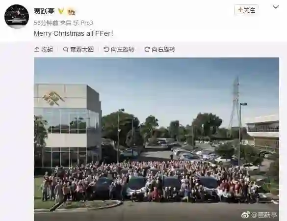 暗示其对所有FF员工送上圣诞祝福。此外,微博配以的图片疑为美国FF员工合影,拍摄背景疑似FF公司或厂房。《证券日报》今日早间报道称,乐视汽车中国在冬至当天(12月22日)召开了一次全员大会。会上,乐视汽车公司COO高景深确认了美国FF融资到位的消息,并表示资金已陆续到账,他激励所有员工拼搏创业,实现战略目标。他还表示,FF将实施中美双主场战略,乐视汽车员工将成为FF中国的员工。