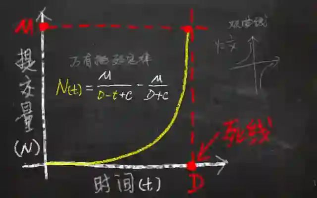 图中的黄线就是杜拉克维茨拟合的曲线,N(t)为第t天提交的申请量,M为最终提交的总申请量,D为提交期限的总天数。公式中C是和D有关的常数,用来校正t很小的情况,公式右边的第二项用来将曲线平移到图中的位置,让t=0时,N(t)=0.