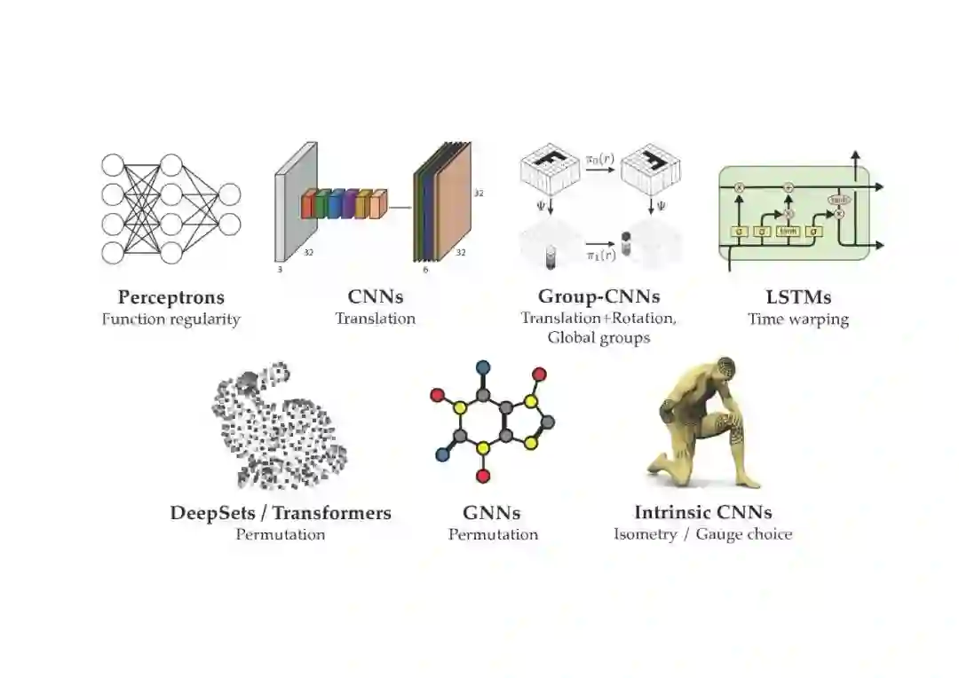 我们研究了流行的深度学习架构(CNNs, GNNs, transformer, LSTMs)的本质,并意识到,只要有一组合适的对称,我们就可以等价它们,它们都可以用一个通用的几何框架来表达。