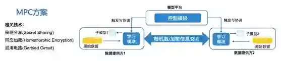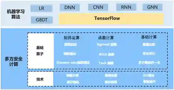 安全技术层:安全技术层提供基础的安全技术实现,比如在前面提到的秘密分享、同态加密、混淆电路,另外还有一些跟安全密切相关的,例如差分隐私技术、DH 算法等等;