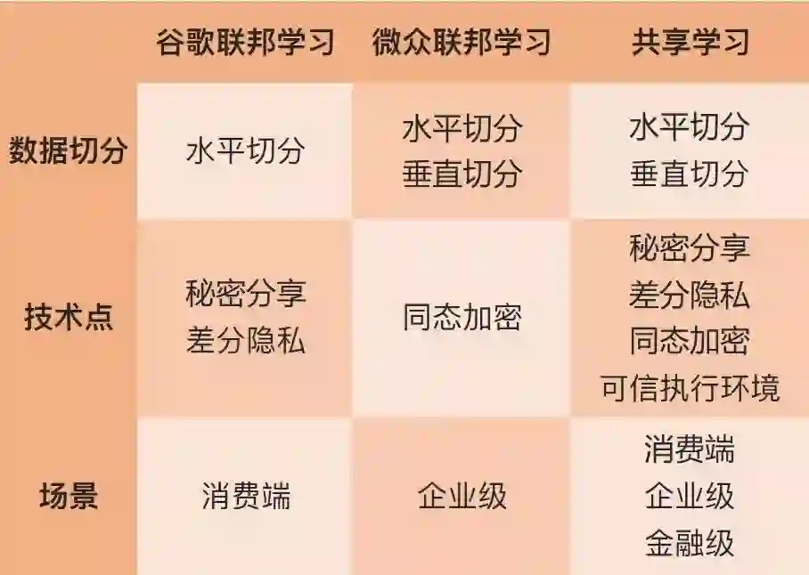 联邦学习只解决数据不出域的情况,这就限制了其可以使用的技术(只有严格的 MPC 算法才符合这个要求),而共享学习目前基于 TEE 的集中式共享学习技术,是联邦学习没有涉及的;