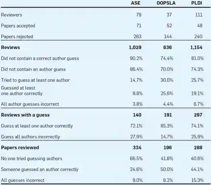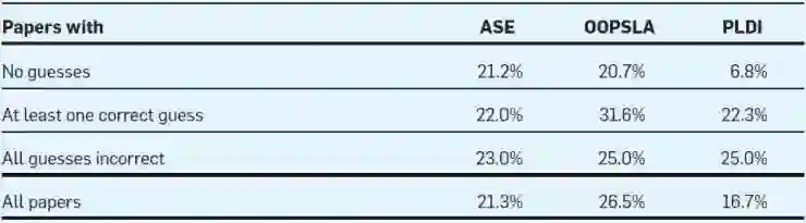 假如评审者在评论中猜测论文作者,他们大概率会猜对(ASE 72% 的猜测能够猜对,OOPSLA是 85%,PLDI 是74%)。不过实际情况中,绝大多数的评审意见中并没有真的包含正确的猜测结果(ASE 90%,OOPSLA 74%,PLDI 81%)。