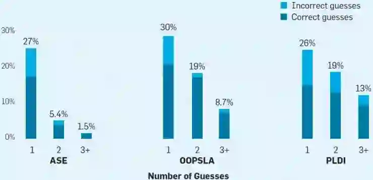 其中 X 代表专家,Y 代表研究学者,Z 代表普通学者(均为自评)。如上图所示,「专家们」显然更喜欢预测,然而预测准确性却没有比另两类人高多少(PLDI 的 Z 类评审除外)。所以结论是那些自认专家的更加喜欢猜测论文作者,正确性却不值一提。