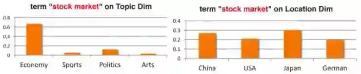 例如「stock market」,它在每个 Location 维度中分布的概率基本一致,这说明「stock market」这个 term 不属于 Location 这个维度;而另一方面,它在 Topic 维度的分布则有很强的差别性。根据一个称为 Dimension-Focal Score 的标准可以判别出它是属于 economy 标签下的。