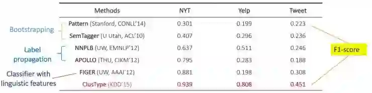 同样的,这对机器来说也并不难。只要有 Pattern,机器可以迅速地从文本中挖掘出相同 Pattern 的大量信息。韩家炜举了他们实验室读博士后的蒋朦在 KDD 2017 上发表的文章。