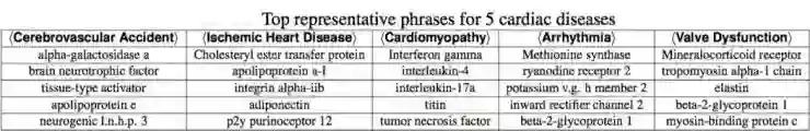 讨论过后,韩家炜等人从 PubMed(一个医学文献库)中抓取了「心血管疾病」相关的十年的数据,大约有 50 万篇 paper。他们使用这 50 万篇 paper、6 类心脏病以及医学教授们列出的 250 种蛋白质,根据和挖掘 NY Times 一样的算法,很快就得到了针对每一类心脏病的相关蛋白质排序,如下表(仅列出 Top 5)。