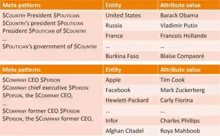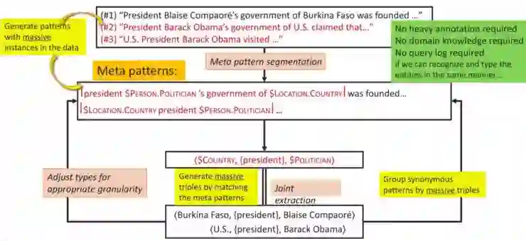 从上面这个图可以很清晰看出他们的工作流程:对语料文本进行 Meta Pattern 分割,得到 Meta Pattern;通过 Meta Pattern 可以找到大量相符的三元组;再通过这些三元组数据进一步地改进 Meta Pattern,例如提升粒度或获得同义的 Meta Pattern。值得注意的是,这种方法并不需要大量的标注数据,也不需要相应的领域知识,同样也不需要搜索日志。
