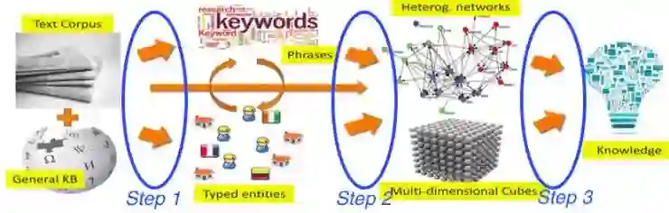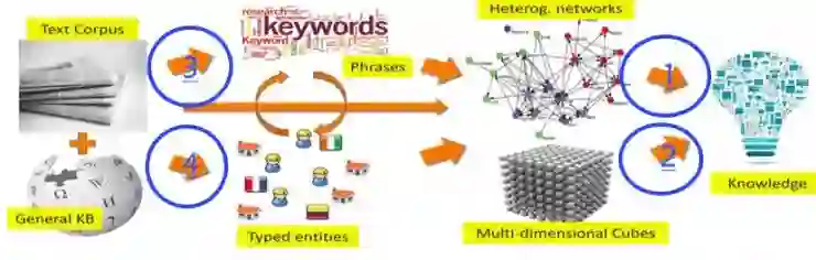 韩家炜团队的人员近几年主要的研究工作正是围绕着这个问题进行的,即怎样从 Text 中挖掘 Phrases、怎样从 Text 中挖掘 Typed Entities、以及怎样把这些 Phrases/Typed Entities 变成 Network/Text-cube(第四节内容)。