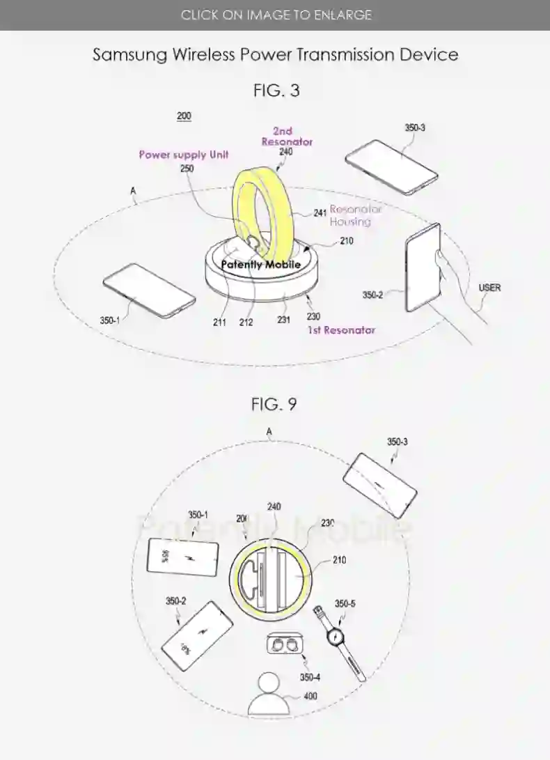据 Patentlyapple 报道,韩国专利局公布了一项三星电子的专利,揭示了三星目前正在研发隔空无线充电技术。三星在他们的专利文件中指出,可以提供一种无线电力传输设备,包括一个可以安装在无线电力传输设备上或其周围任何位置的谐振器,用于扩大无线电力的传输半径。此外,三星的无线电力传输装置可以为三个以上的设备充电,包括手机、耳机、智能手表等。