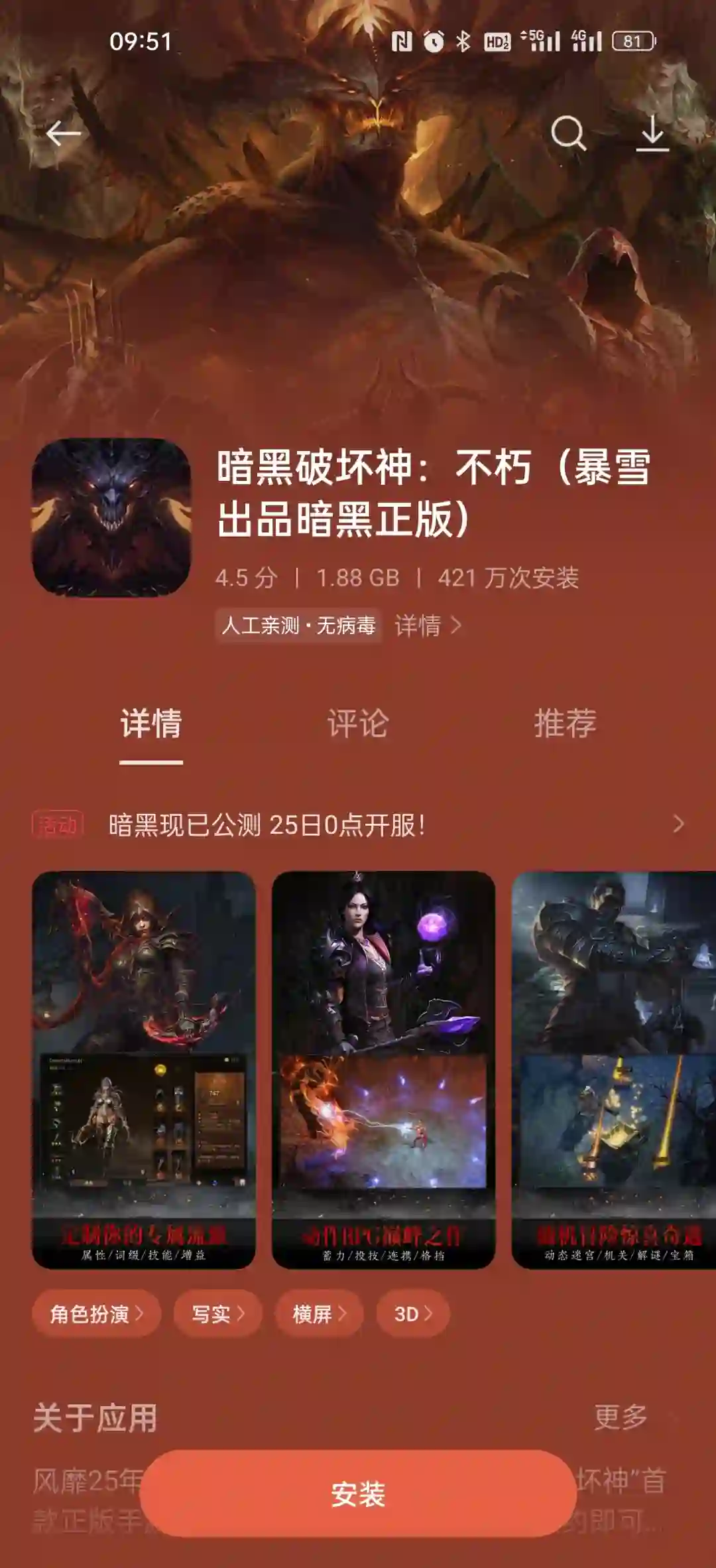 《暗黑破坏神:不朽》国服现已开启预载,而页面显示仍显示于 7 月 30 日上线,可 Android 和 iOS 区已经能够成功登陆游戏,自上线后下载量已突破 2000 万。《暗黑破坏神:不朽》的定位是移动端的3A级大作。 游戏继承了暗黑系列独特的暗黑画风和恢弘的世界观,也创造了全新的故事剧情和玩法。
