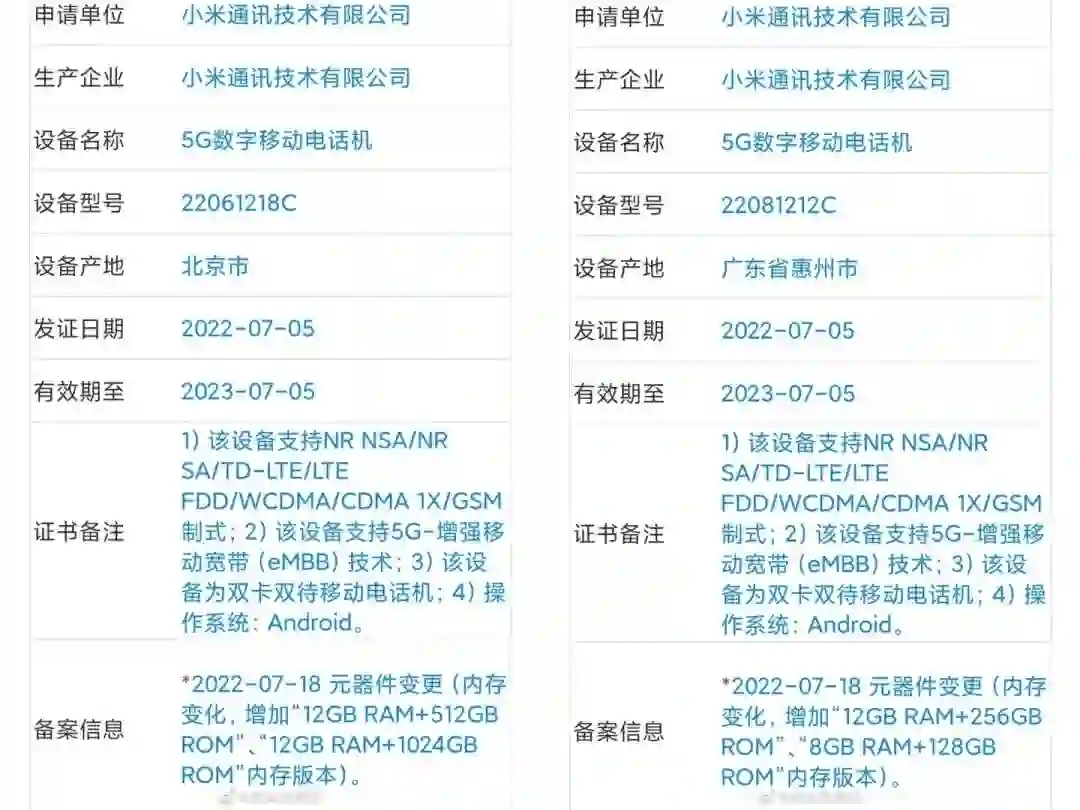 小米两款骁龙 8+ Gen 1 新机三证齐全